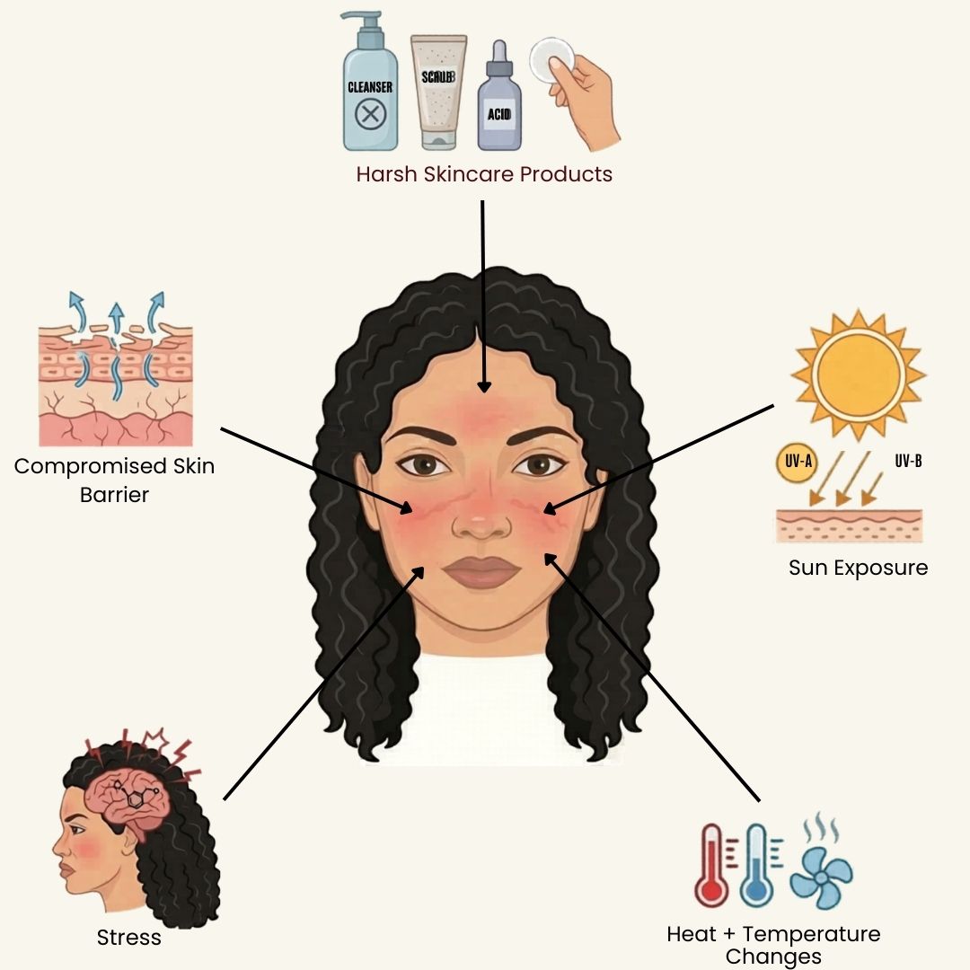 Skin redness can be caused by different internal and external factors that irritate the skin or weaken its natural protective barrier. Identifying these triggers can help reduce flare-ups and support healthier, calmer skin over time.